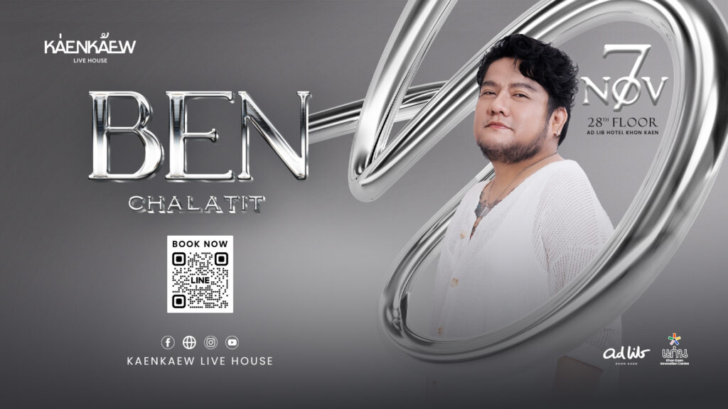 For the first time, Ben Chalatit is coming to KaenKaew Live House! Experience a powerful live performance filled with soulful vocals and timeless hits, all in an intimate rooftop on the 28th floor of Ad Lib Khon Kaen, overlooking the city skyline.