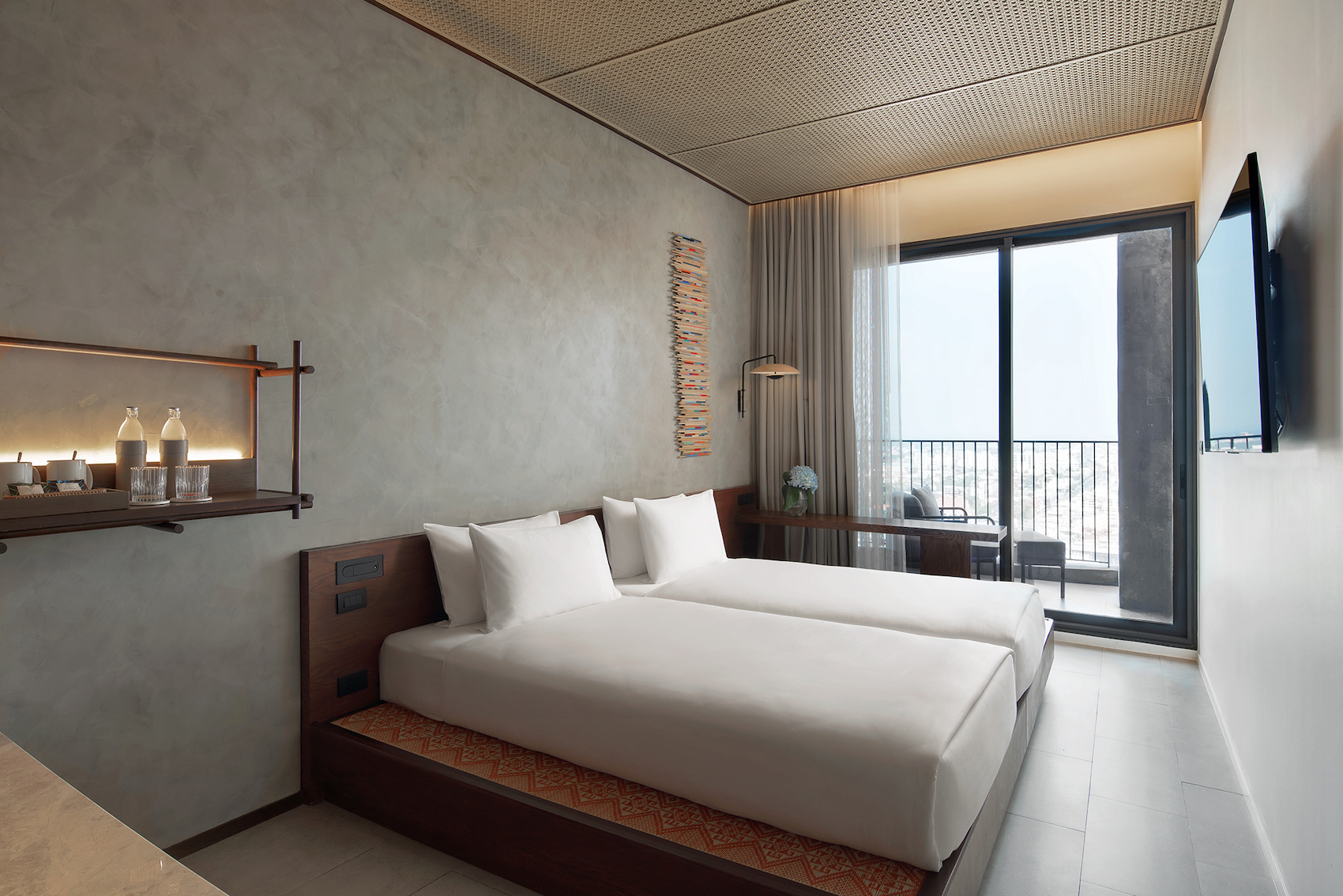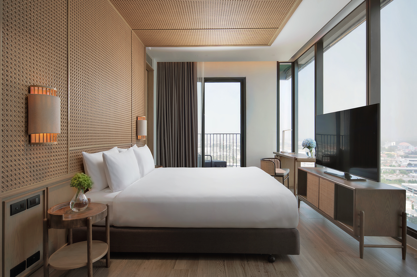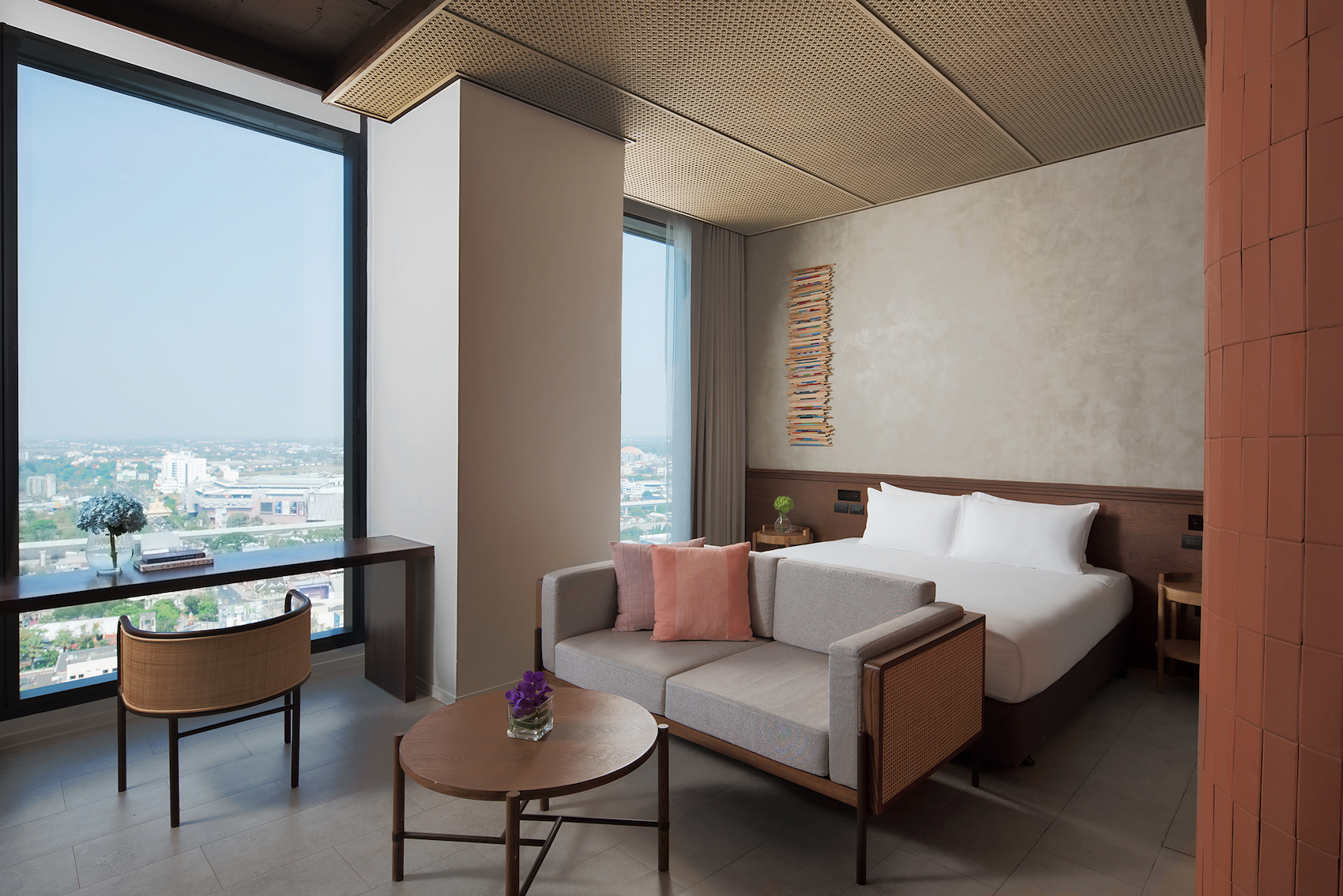 Light and airy floor-to-ceiling windows in 34 sqm rooms with walk-in closet and expansive views of the city from your workstation.